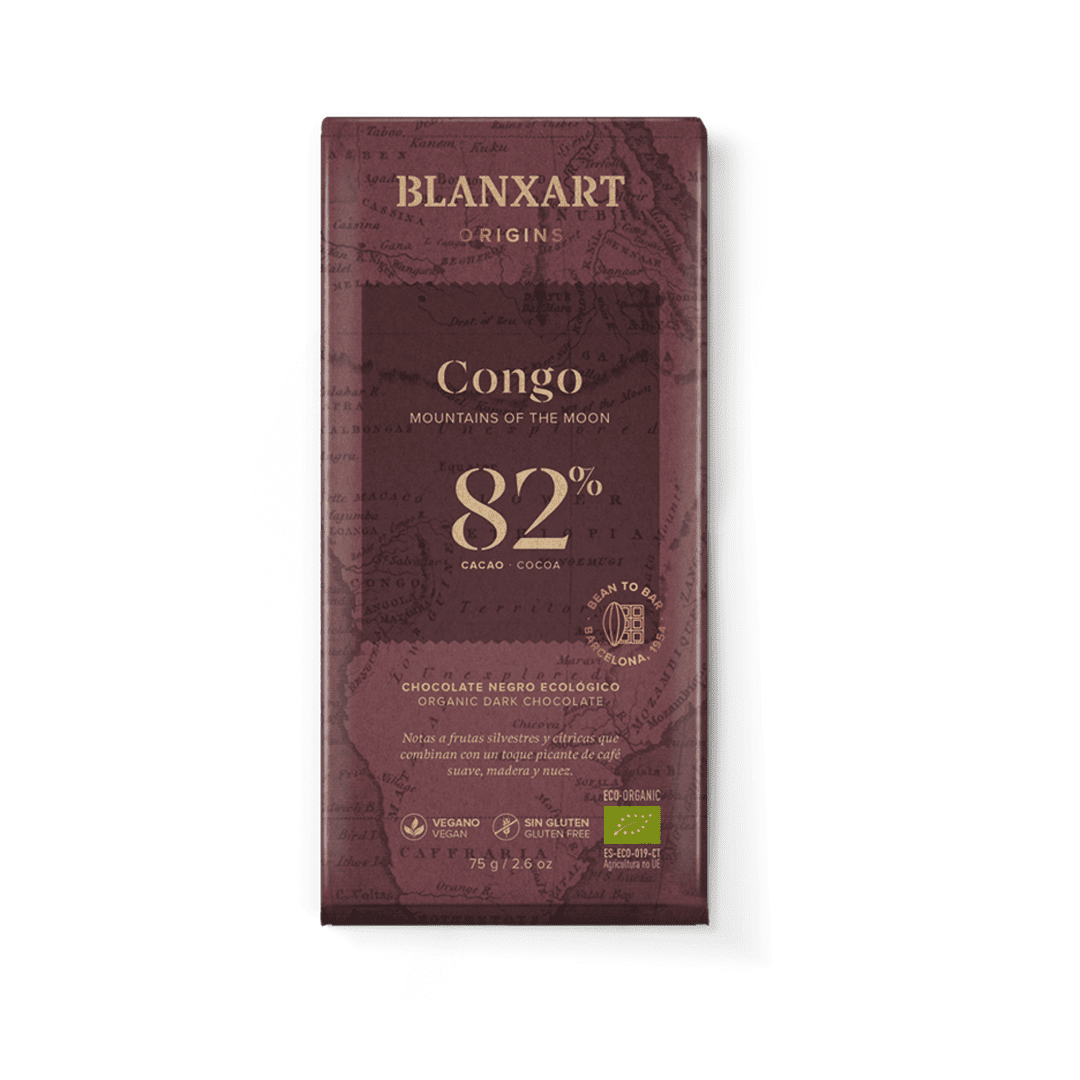 Ingredientes: Cacao*, azúcar*, manteca de cacao*. Cacao 82% mínimo. *De Agricultura Ecológica. Valores nutricionales (100 g): Energía: 2494 kJ / 602 kcal, Grasas: 47,7 g (saturadas: 29,1 g), Hidratos de carbono: 27,0 g, Proteínas: 10,5 g, Sal: 0,01 g.